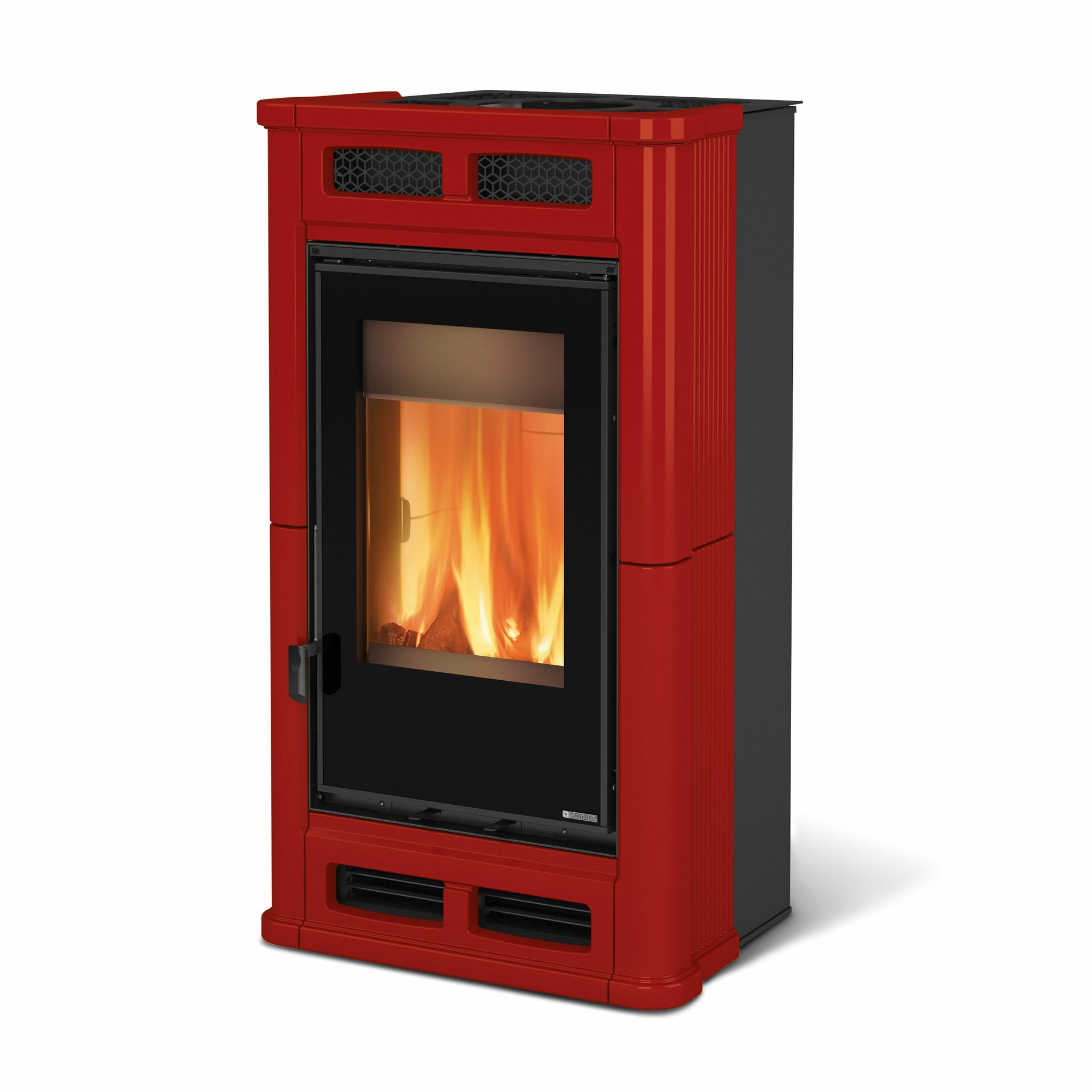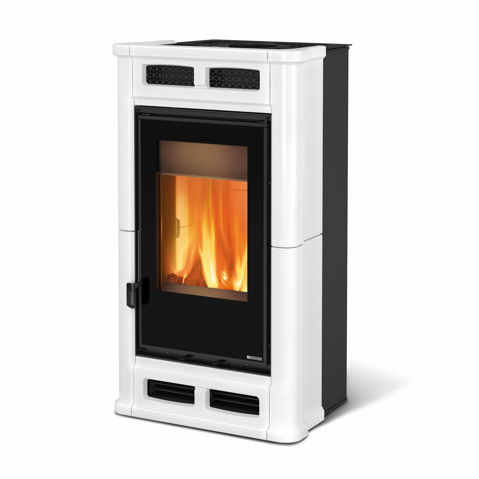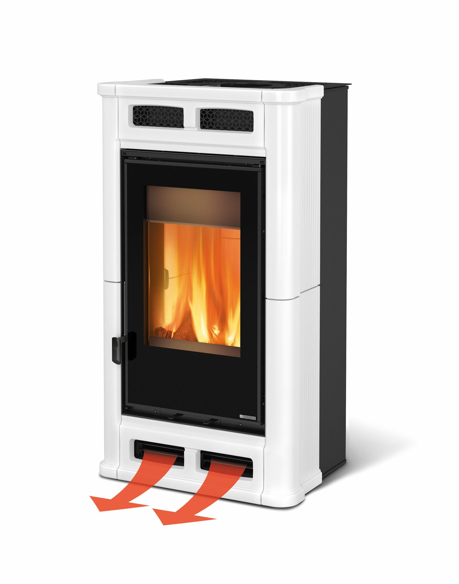 Ventilated wood burning stove with hand-crafted majolica cladding and PRS system. Adjustable room ventilation. Enameled cast iron doors, top, base and frame. Internal facing of the hearth in cast iron and Nordiker. Vertical flame hearth.