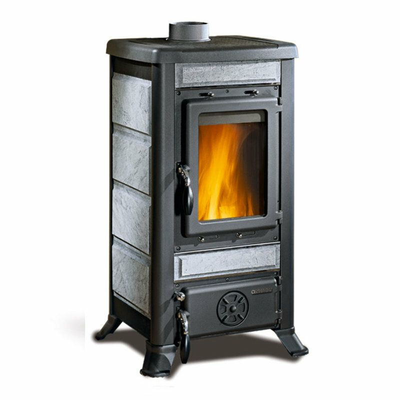 Wood burning stove with external facing in majolica or in natural stone. Enameled cast iron doors, top and frame. Internal facing of the hearth in cast iron. Ceramic glass.