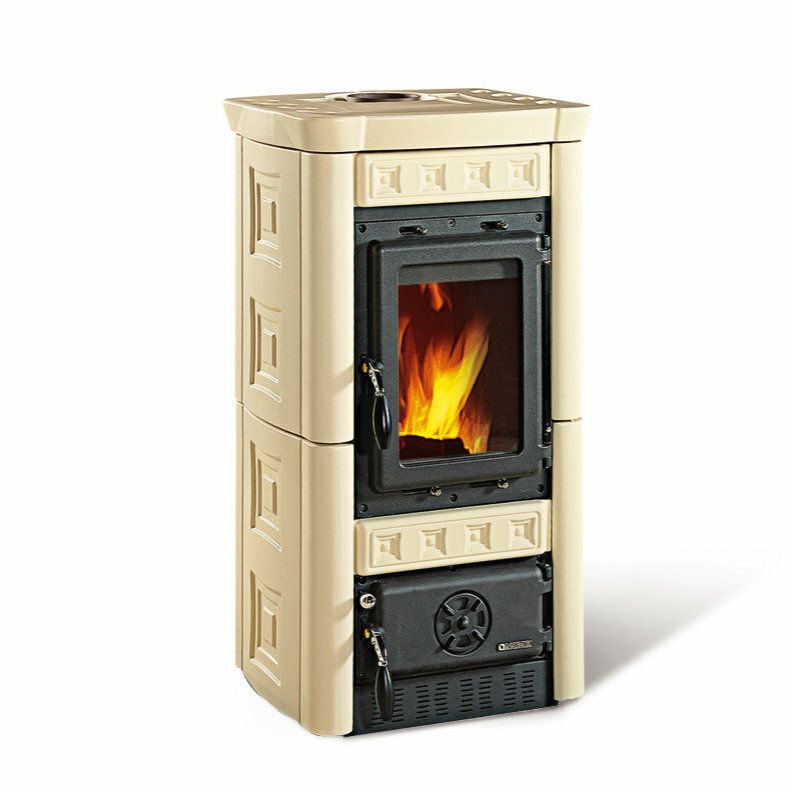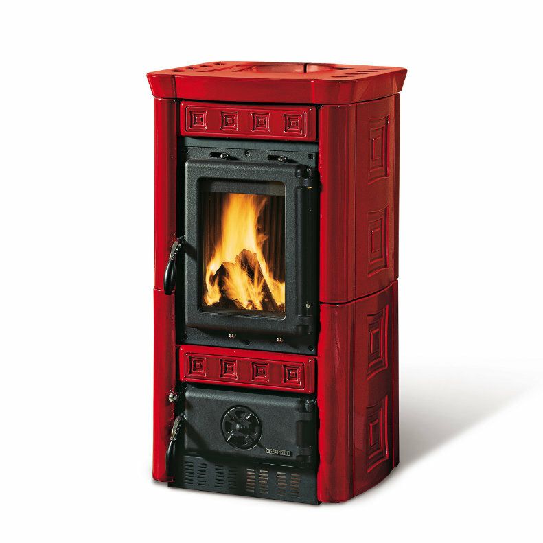 Wood burning stove with hand-crafted majolica cladding. Enameled cast iron doors and frame. Internal facing of the hearth in cast iron. Ceramic glass.