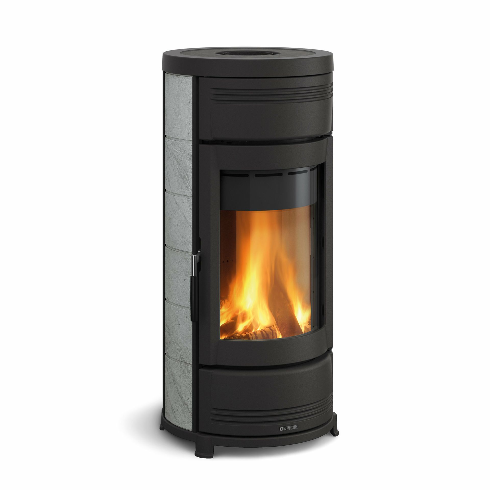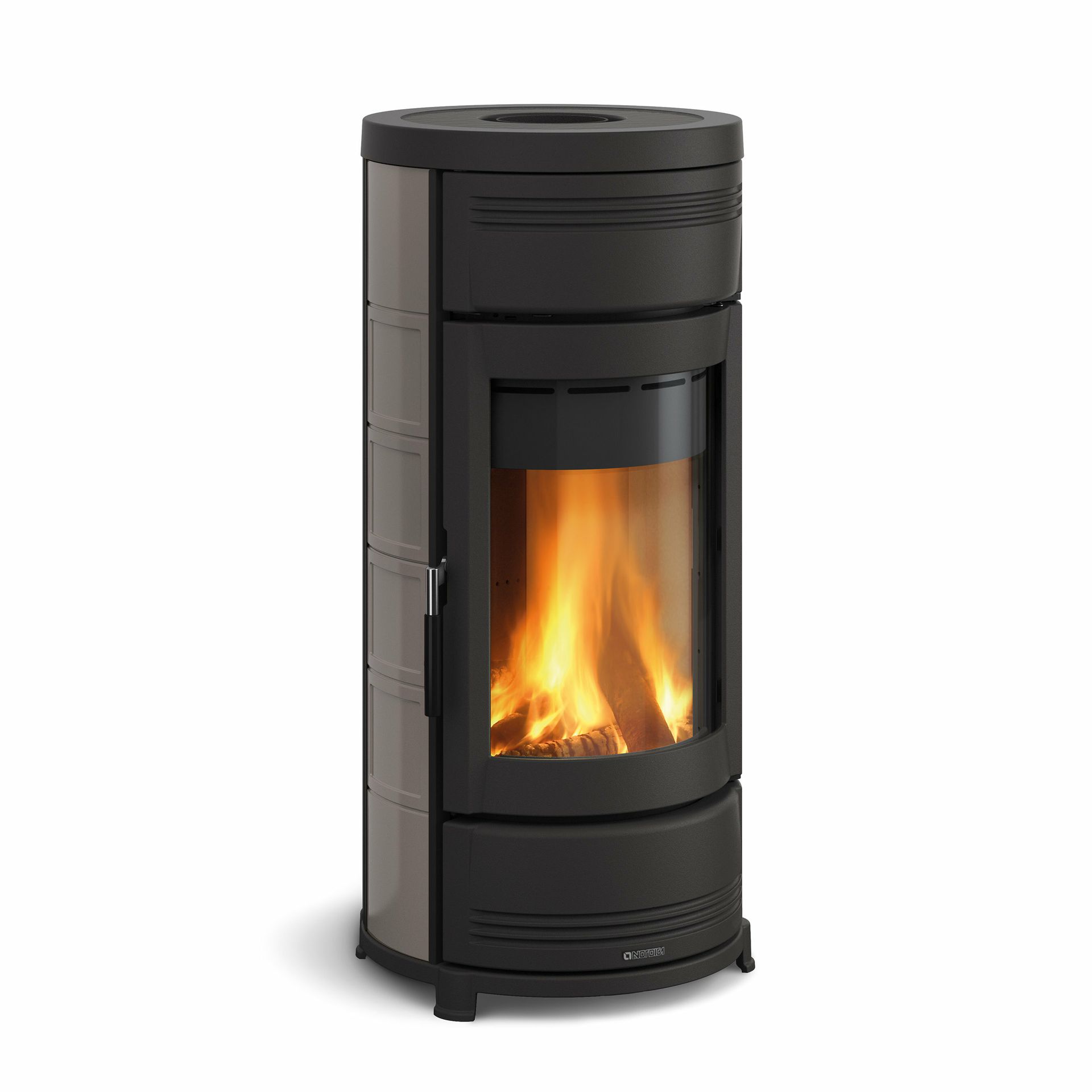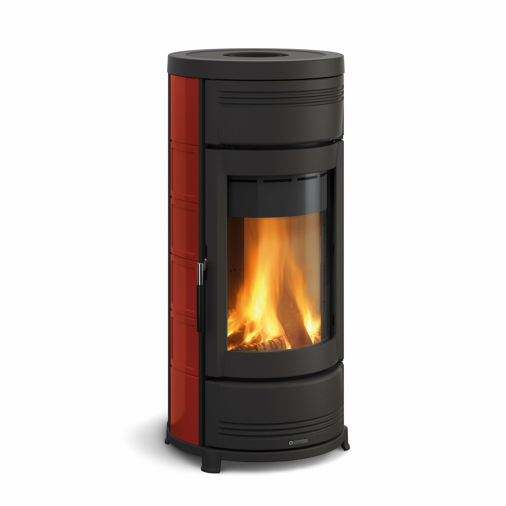 Wood burning stove with cuved ceramic door glass and a wide fire vision. Vertical flame hearth. Enameled cast iron door, top and base. Internal facing of the hearth in cast iron and Nordiker.