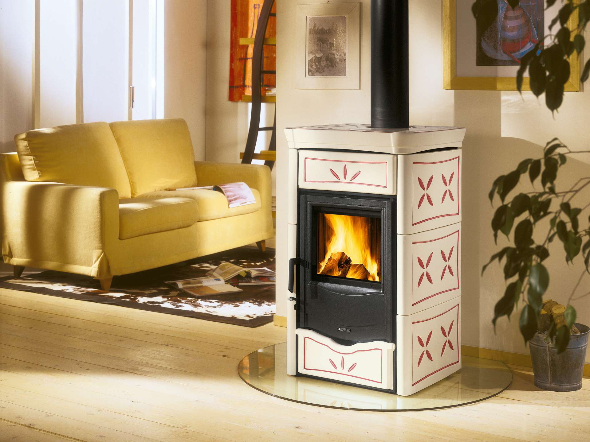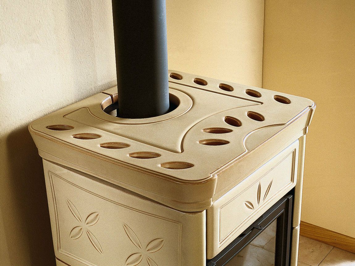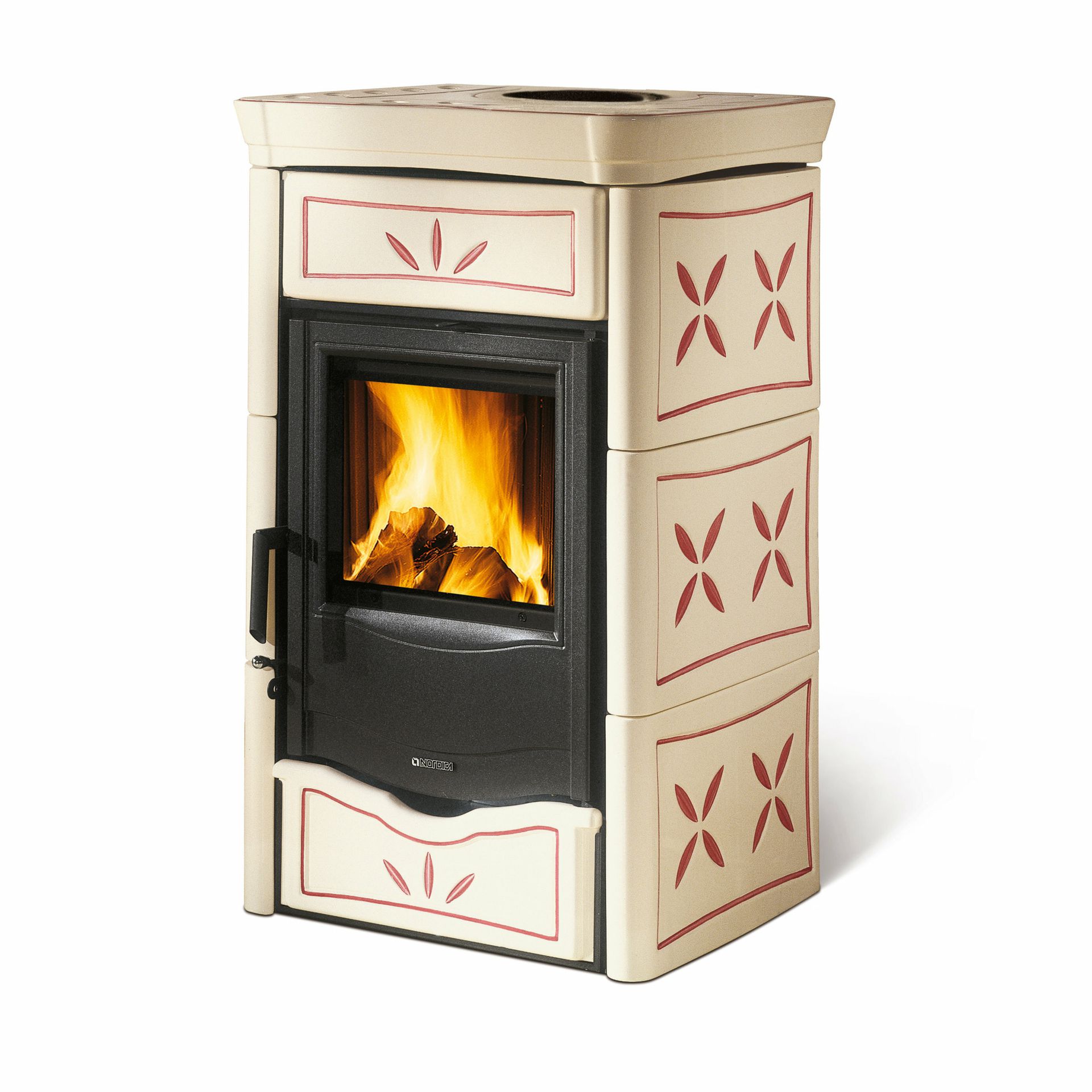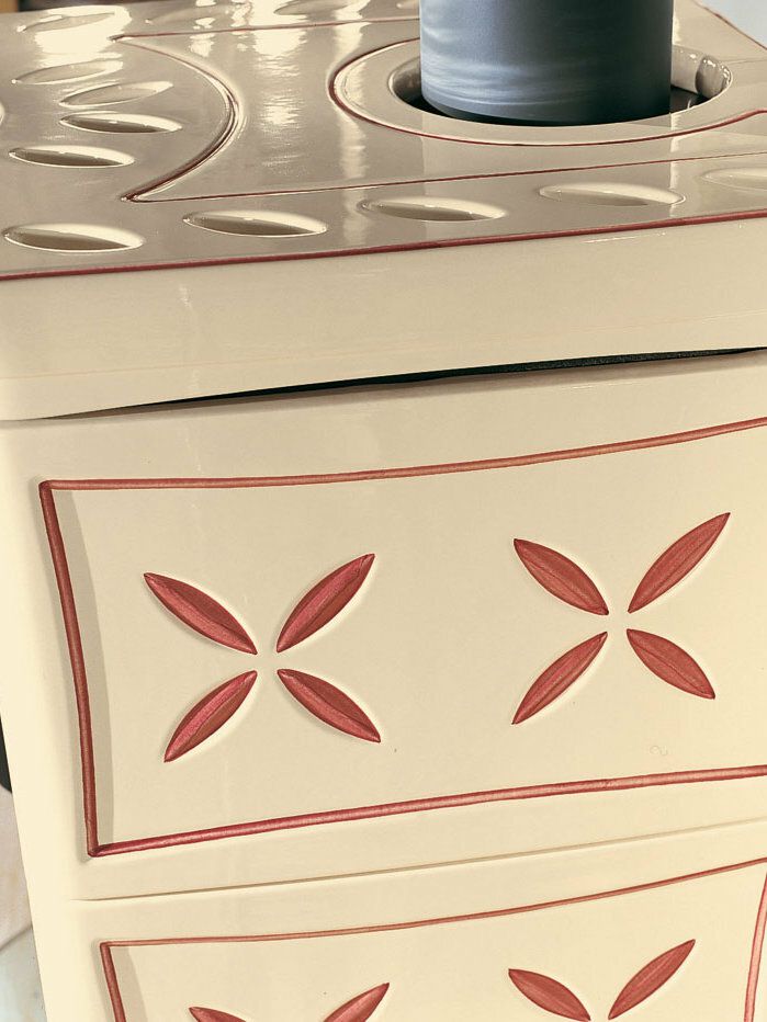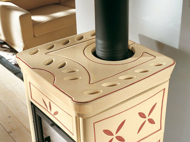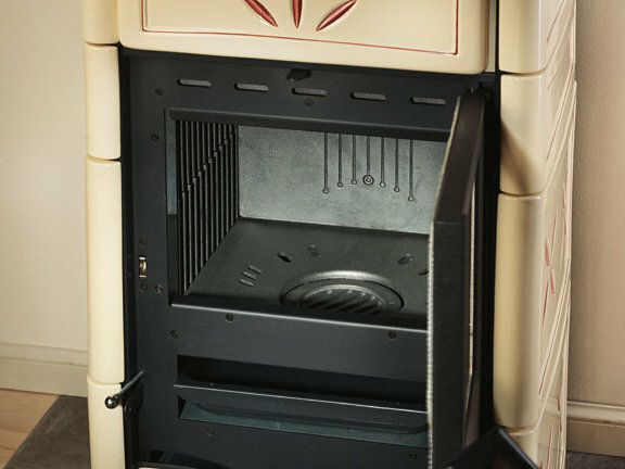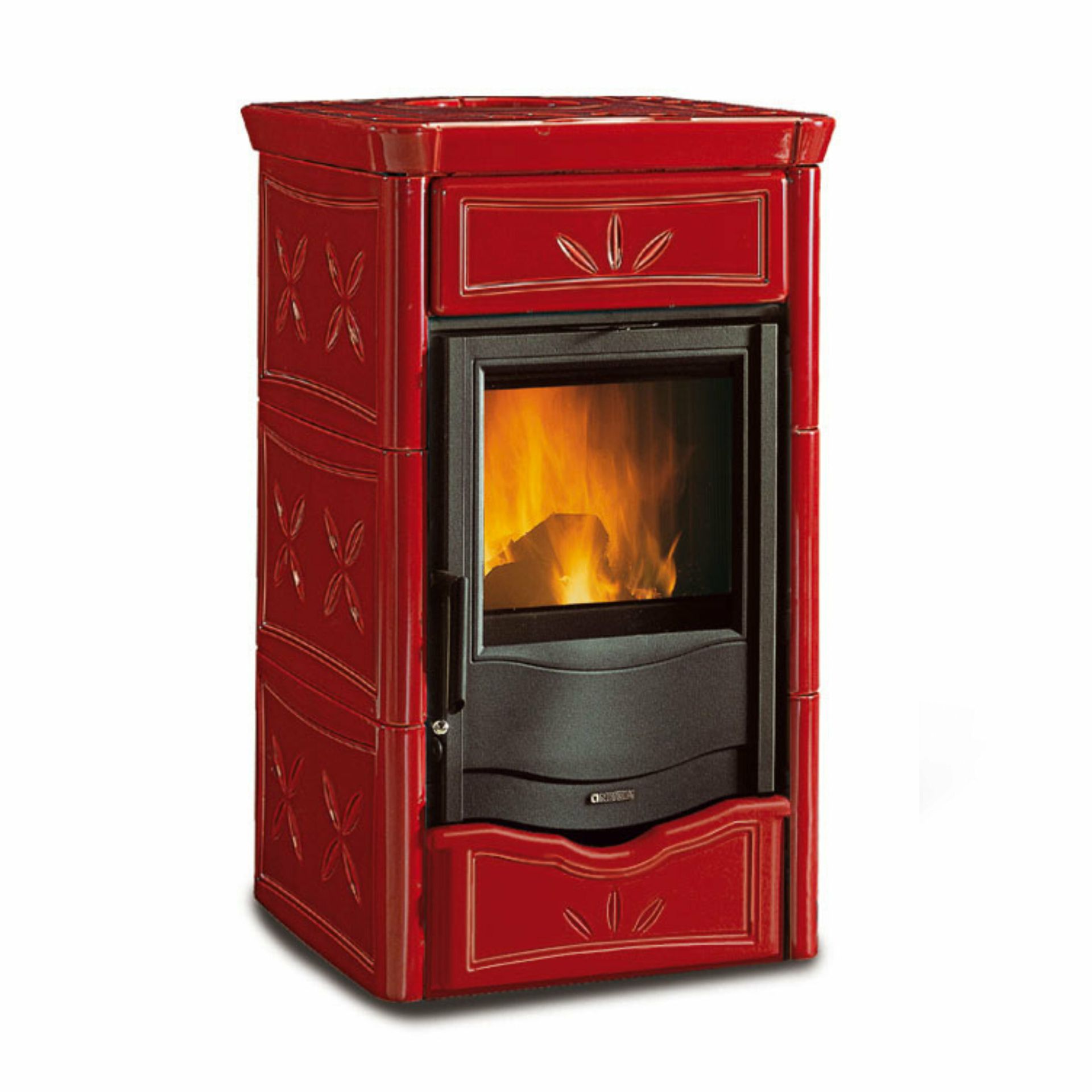 Wood burning stove with hand-crafted majolica cladding. Enameled cast iron doors. Internal facing of the hearth in cast iron. Ceramic glass with a wide fire vision.