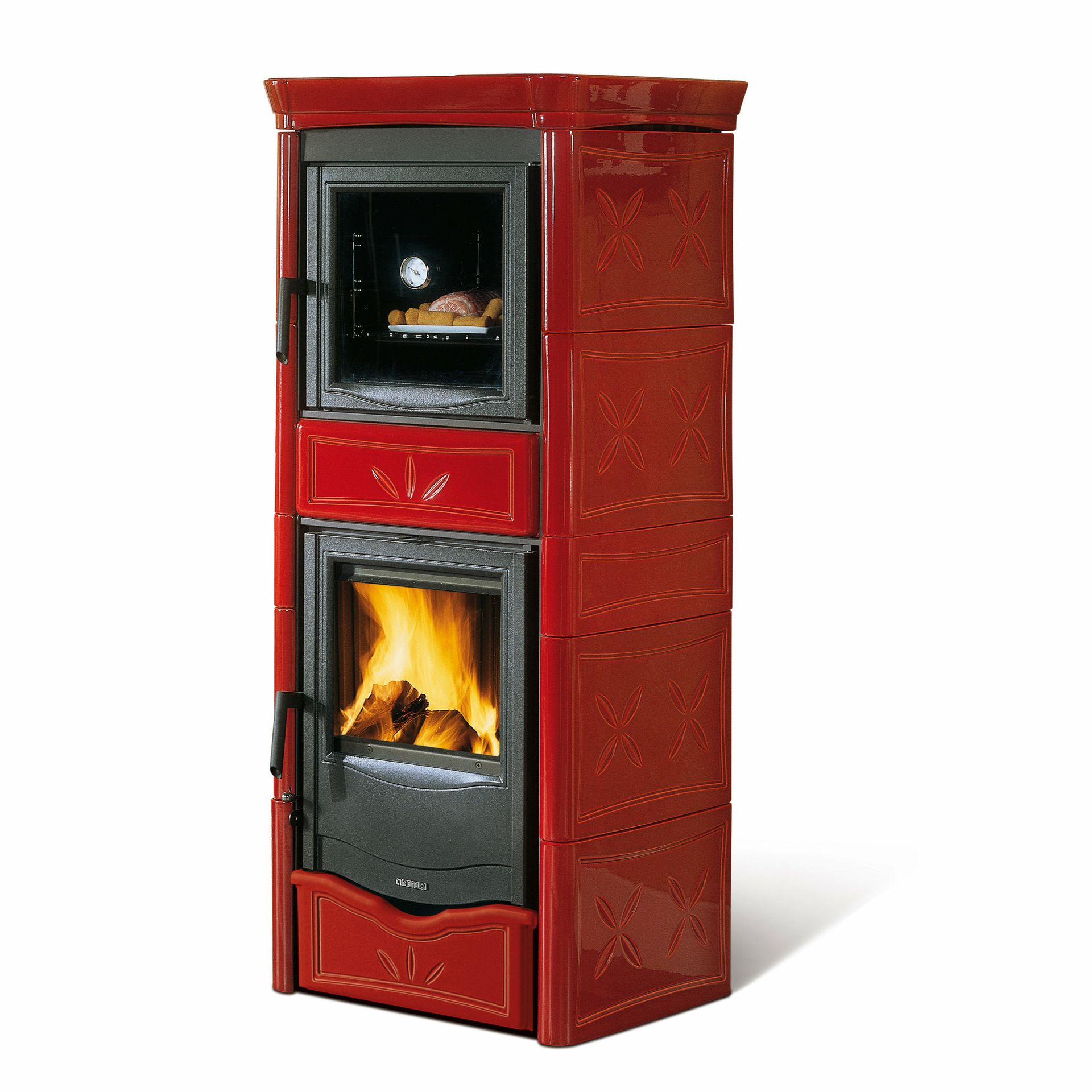 Wood burning stove with hand-crafted majolica cladding. Enameled cast iron doors. Internal facing of the hearth in cast iron. Ceramic glass with a wide fire vision.
