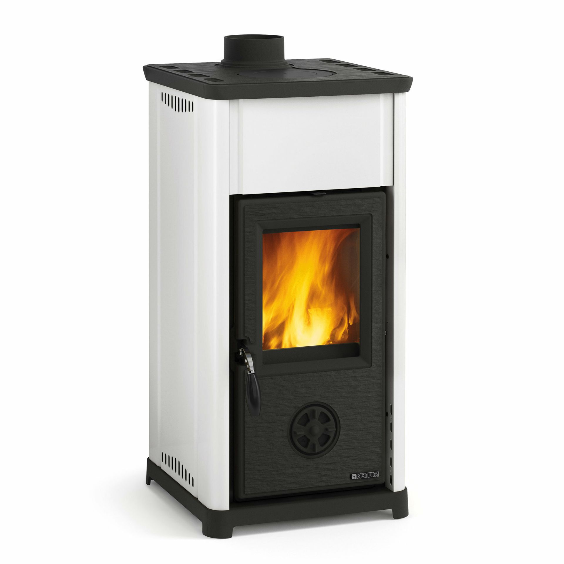 Wood burning stove with enameled cast iron door, top and base. Internal facing of the hearth in refractory. Grid shaker. Ceramic glass.