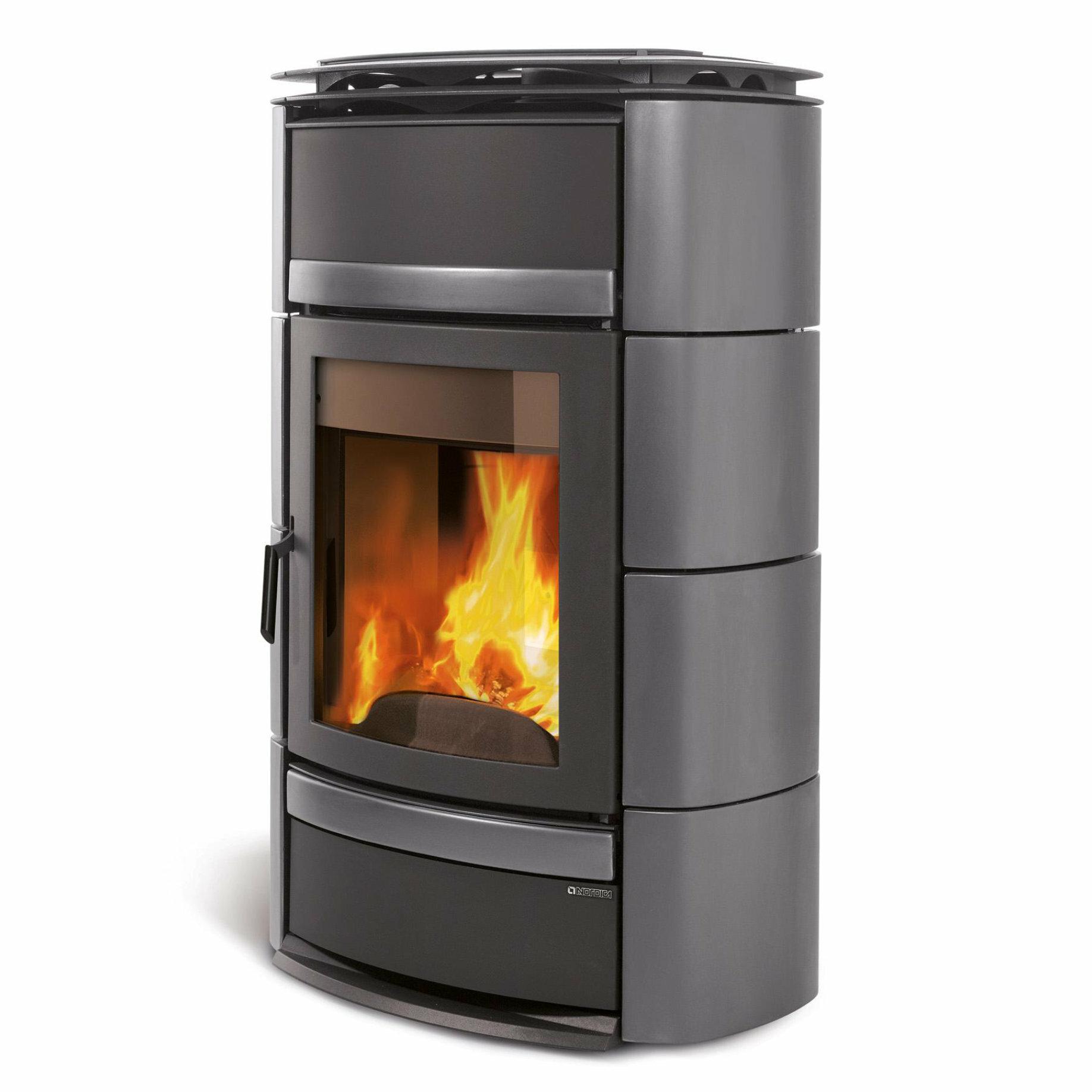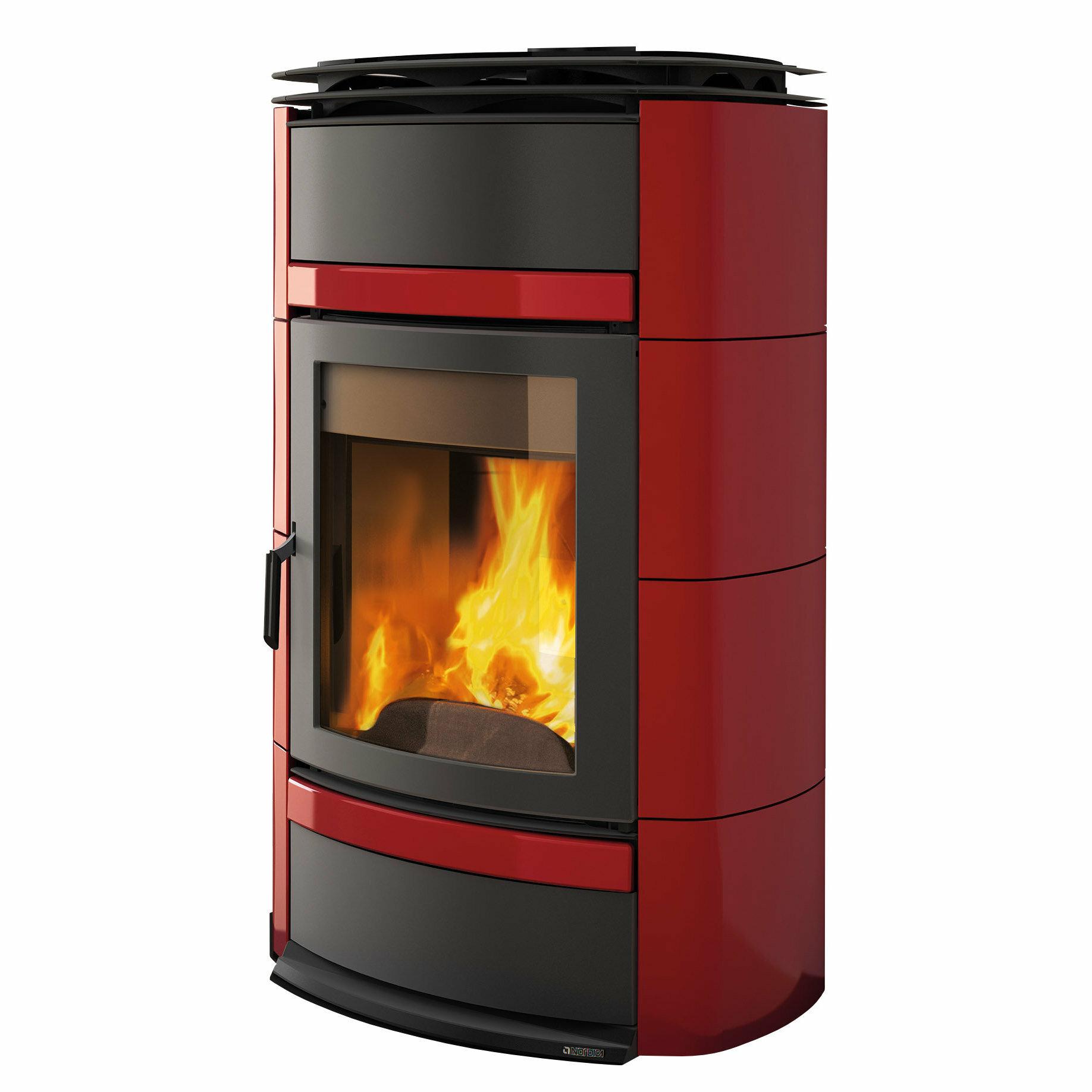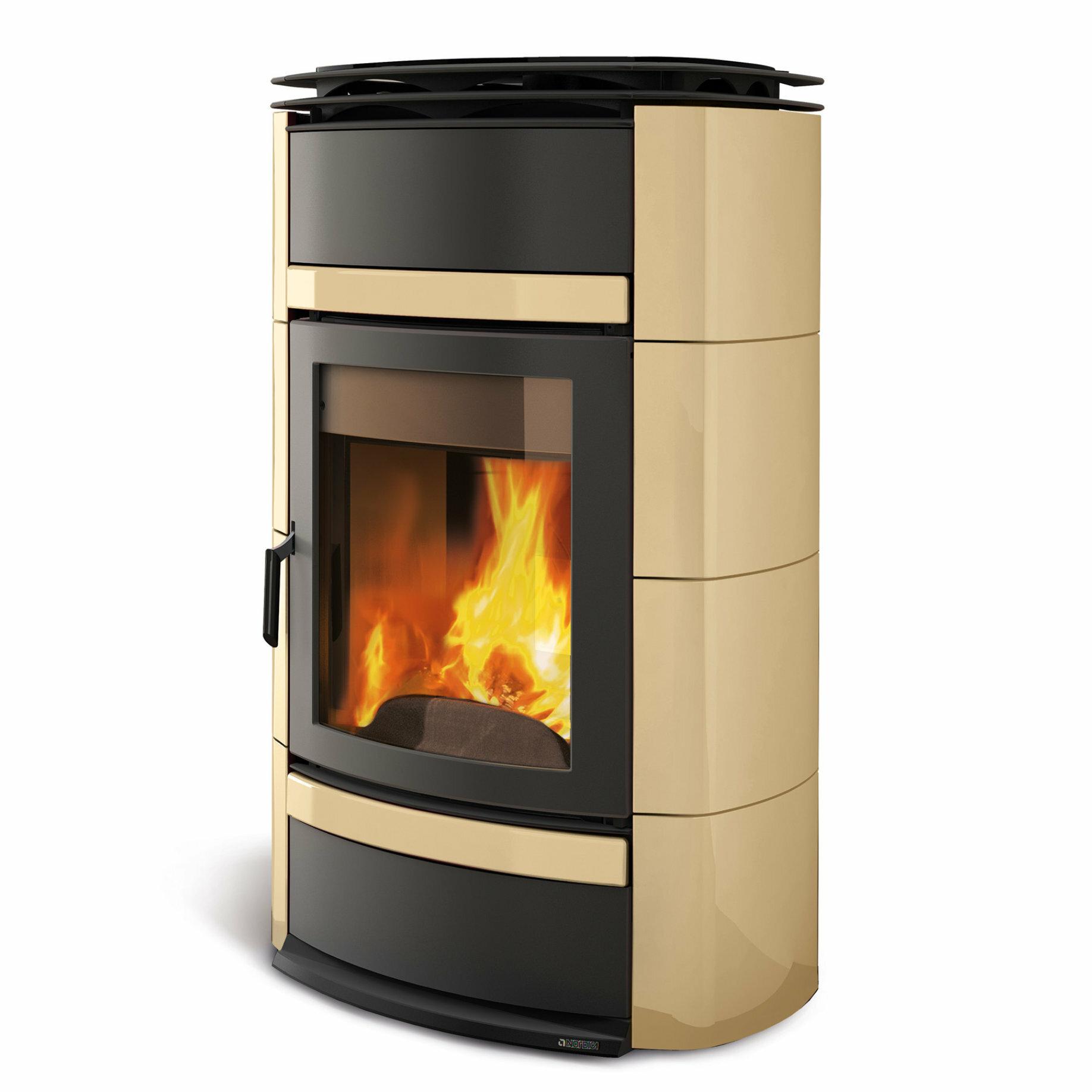 Wood burning thermo-stove with DSA security device (DSA valve not included) and hand-crafted majolica cladding. Internal facing of the hearth in cast iron and steel. External air intake. Enamelled cast iron door with curved ceramic glass for a wide fire vision.